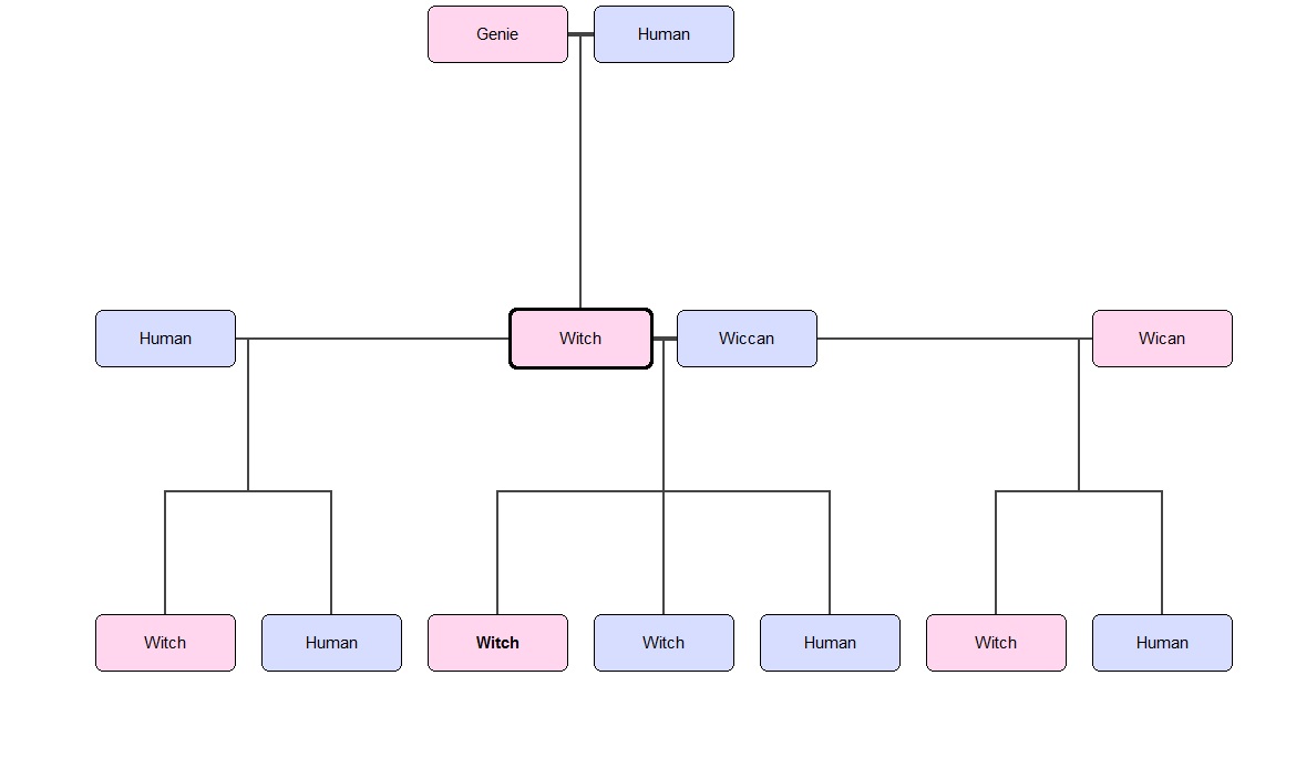 Witches are born. Always. They are a hybrid supernatural resulting from the mixed breeding of a Jinn/Genie and a human. In essence, they are a very diluted Fairy. One of your parents must be a Genie, a Witch or a Wiccan for you to be classified as a witch. (See diagram courtesy of Family Echo, below.) A witch’s powers manifest by the time they are toddlers, however, full use of their powers do not occur until puberty.